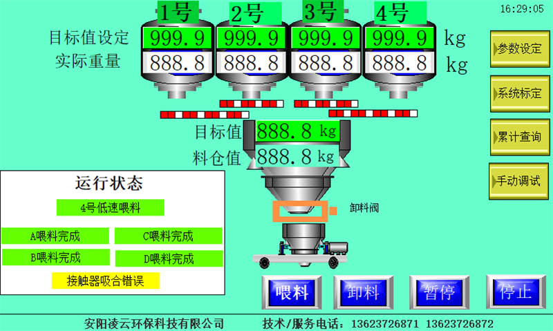 設(shè)置多個(gè)獨(dú)立儲(chǔ)料倉和多個(gè)獨(dú)立計(jì)量倉,對(duì)每種需要計(jì)量的物料預(yù)先按照各自配方進(jìn)行喂料控制(分為高速喂料和低速喂料、提前量控制)進(jìn)入計(jì)量倉內(nèi),等待生產(chǎn)需要時(shí)可以直接同步進(jìn)行卸料。